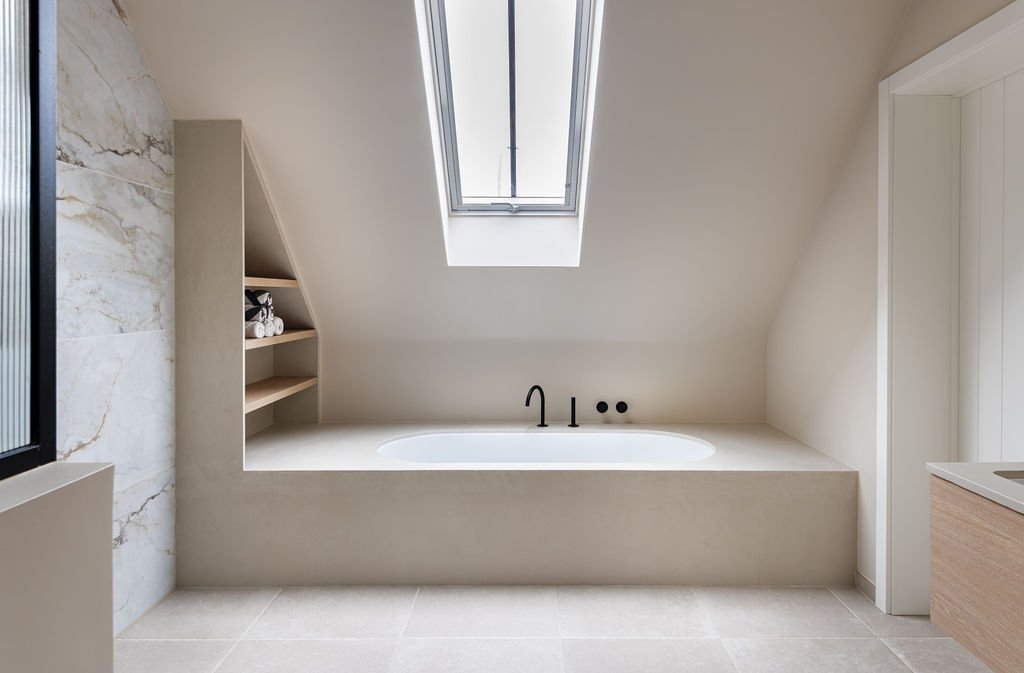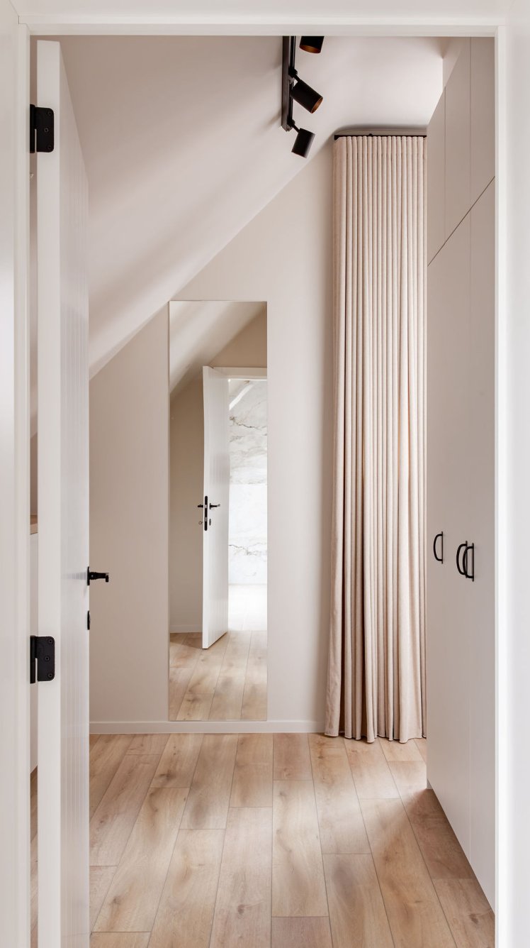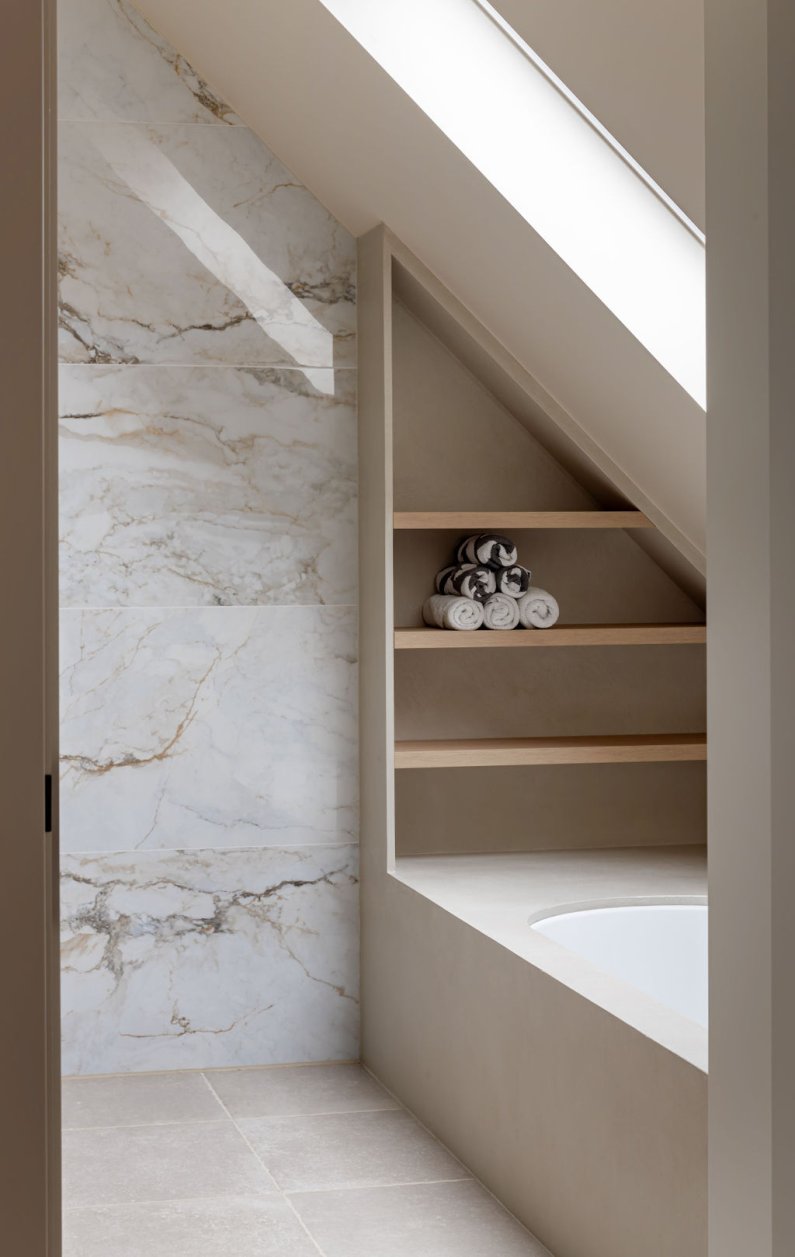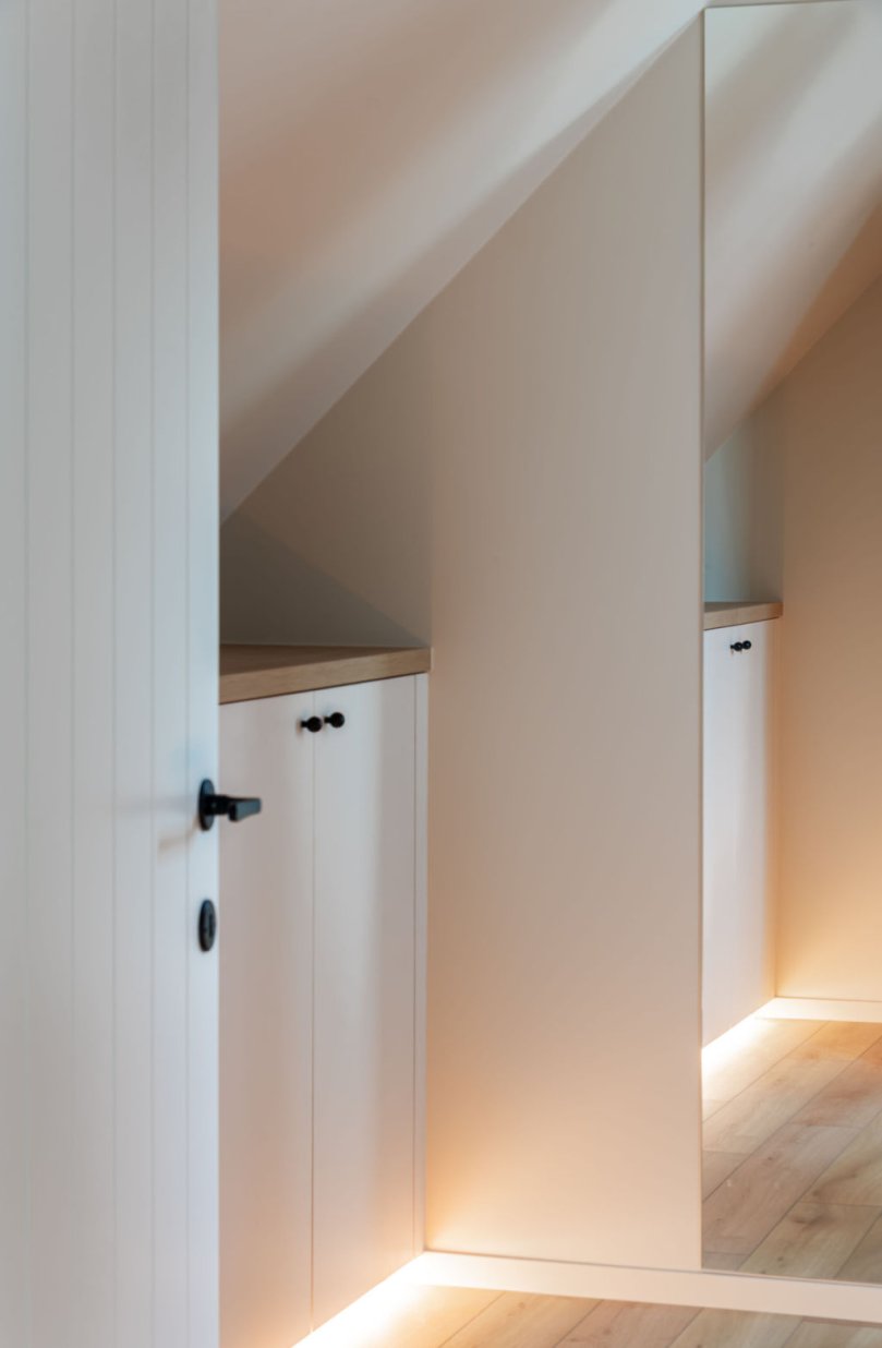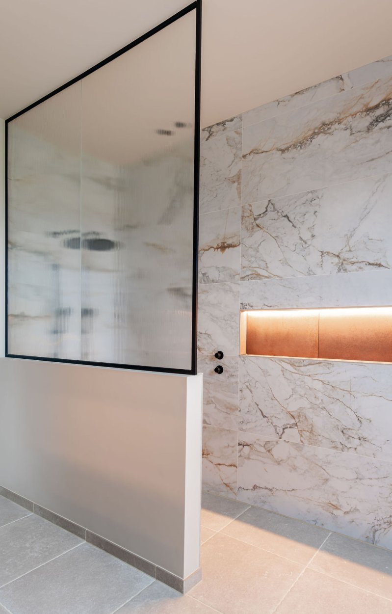 We realiseerden maatwerk in de nachthal, slaapkamers en onder de schuine dakvlakken, zodat elke ruimte optimaal benut wordt. Twee badkamers, elk met hun eigen troeven: boven een inloopdouche en ingebouwd bad, beneden een douche met zitbank die comfort en elegantie combineert.