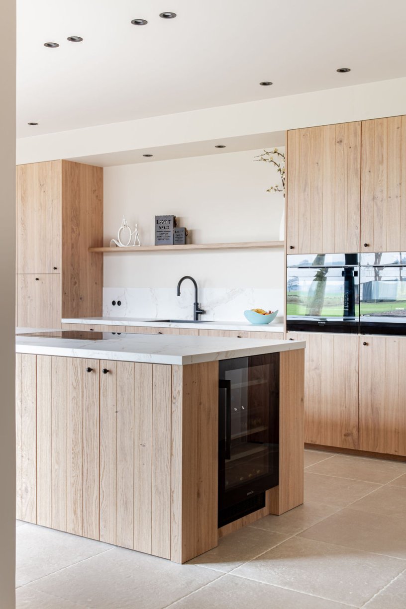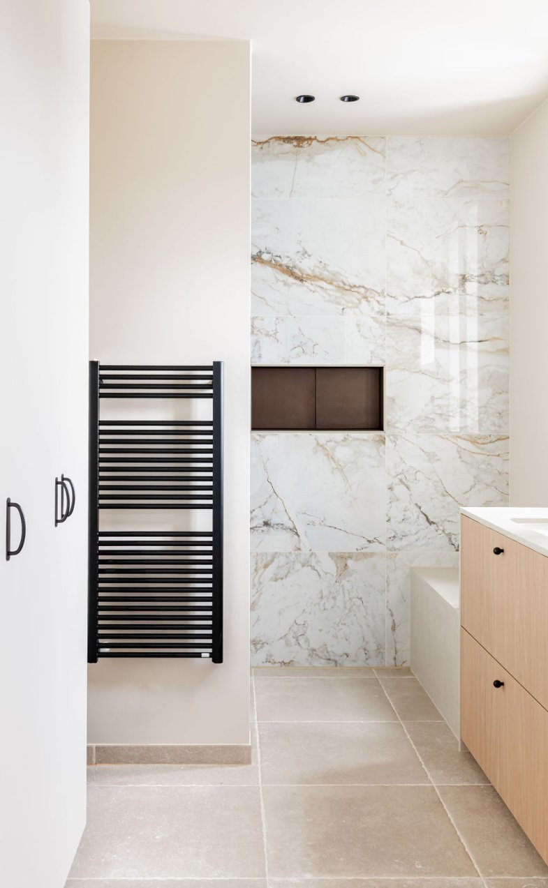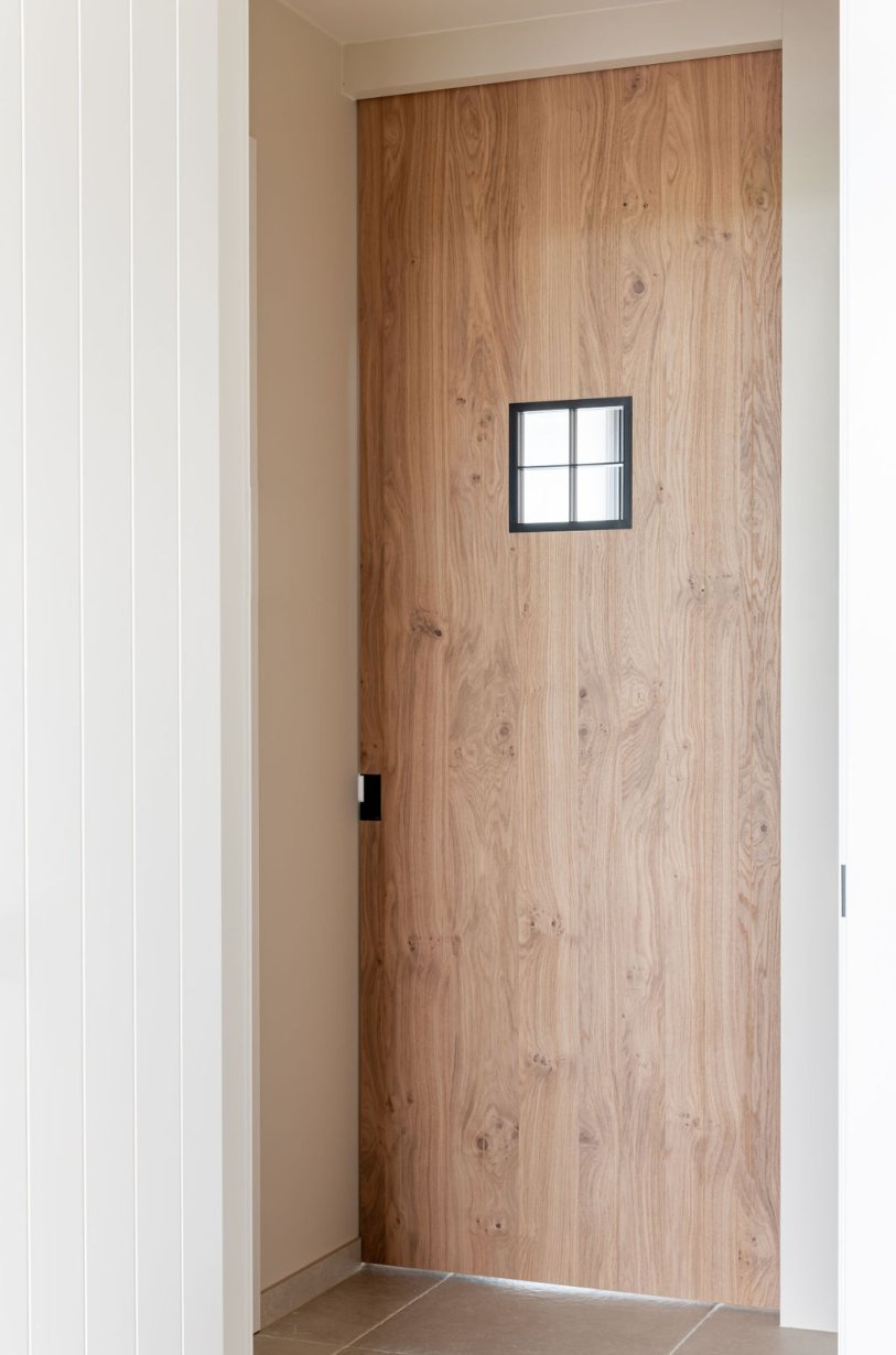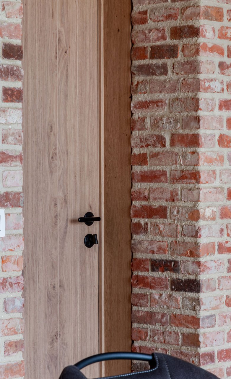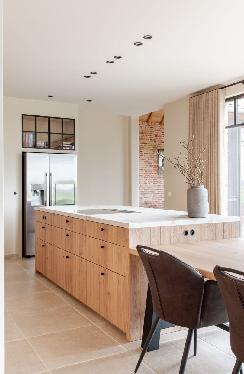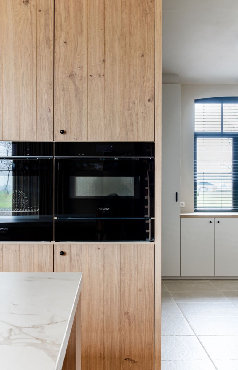Het interieur combineert lichte eik met zwarte accenten in greepjes en details, een lijn die doorheen de hele woning wordt doorgetrokken. De keuken kreeg een verfijnde uitstraling dankzij eiken dikfineer en een keramisch werkblad in Dekton Entzo ; een materiaal dat ook terugkomt in andere ruimtes. De vrijstaande Amerikaanse koelkast en de pivoterende, verborgen deur naar de wasplaats maken het geheel praktisch én elegant.