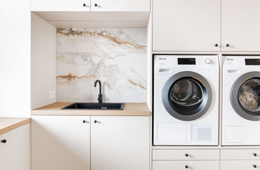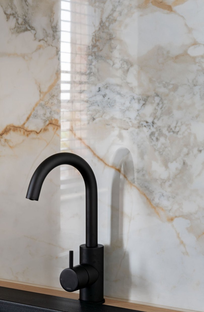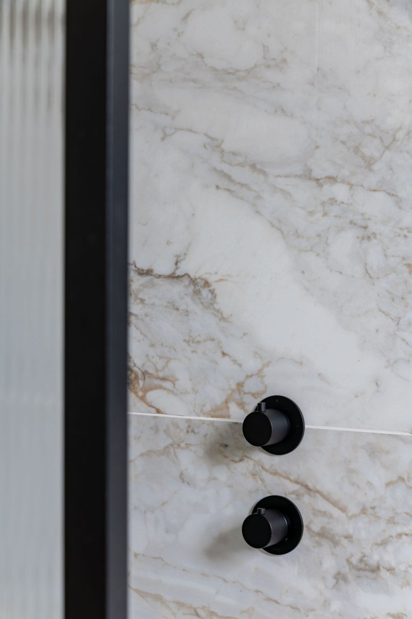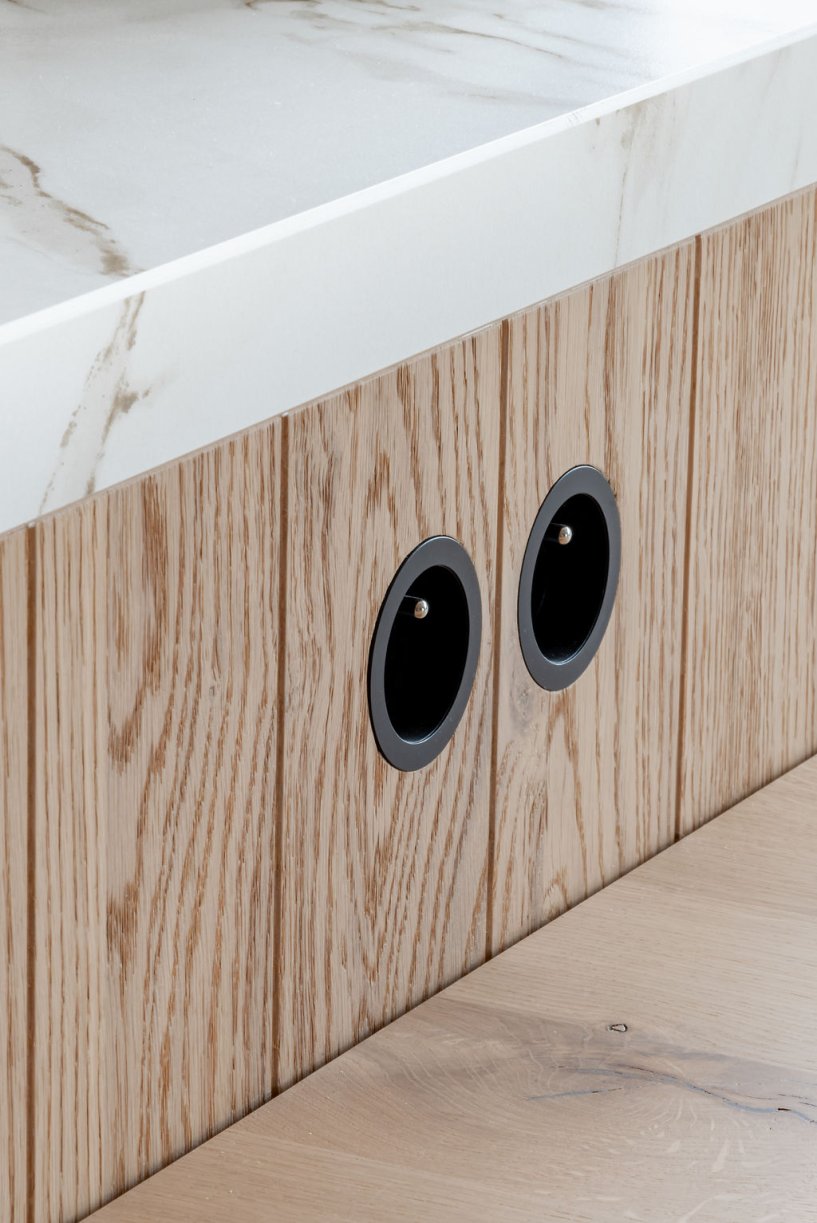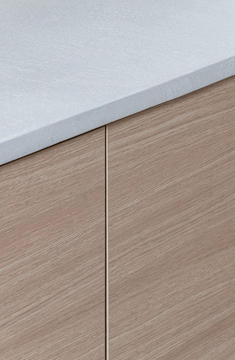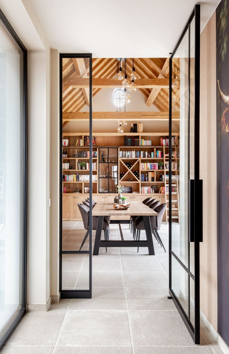 Het interieur combineert lichte eik met zwarte accenten in greepjes en details, een lijn die doorheen de hele woning wordt doorgetrokken. De keuken kreeg een verfijnde uitstraling dankzij eiken dikfineer en een keramisch werkblad in Dekton Entzo ; een materiaal dat ook terugkomt in andere ruimtes. De vrijstaande Amerikaanse koelkast en de pivoterende, verborgen deur naar de wasplaats maken het geheel praktisch én elegant.