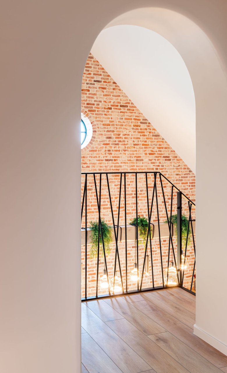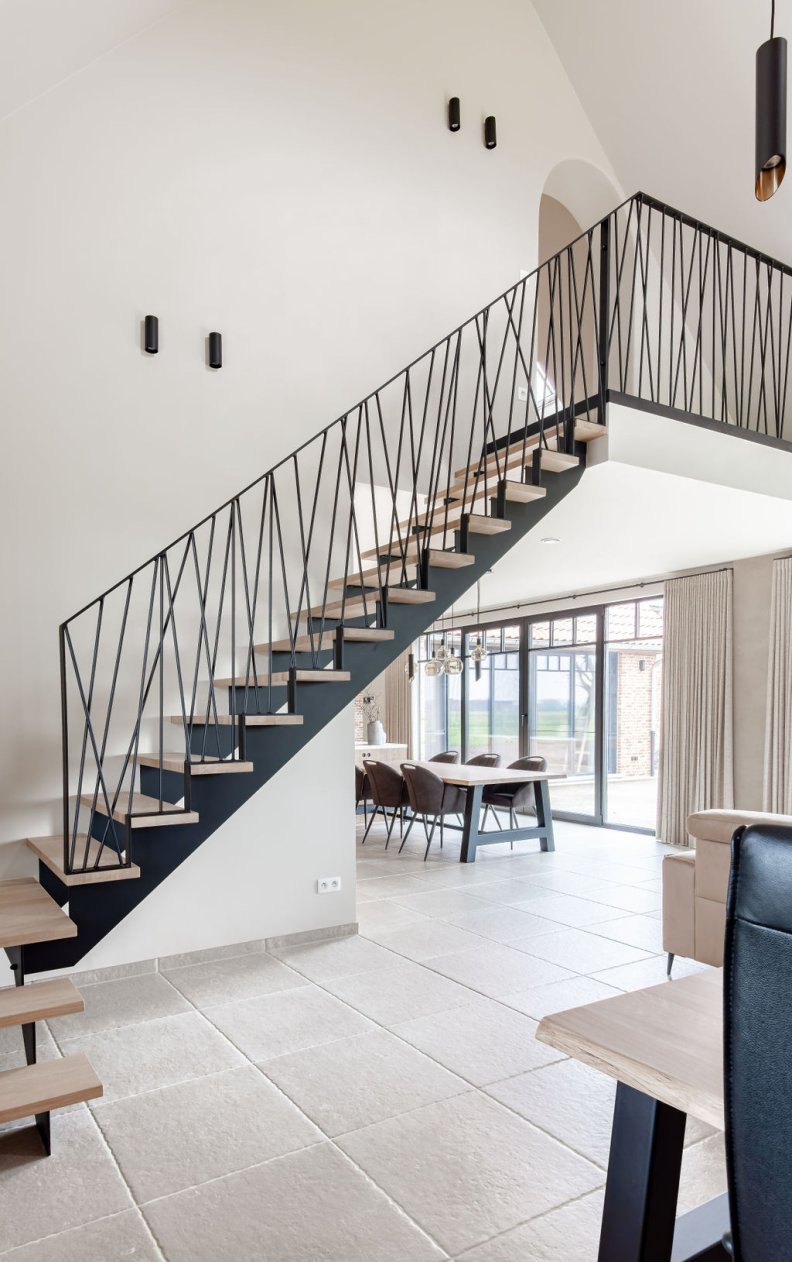 De stalen trap met houten treden en een balustrade in een speels kris-kras patroon geeft de woning karakter en een uitgesproken identiteit. Eiken binnendeuren en een glazen steellook deur naar de tuinkamer zorgen voor een vloeiende verbinding tussen de verschillende leefruimtes.